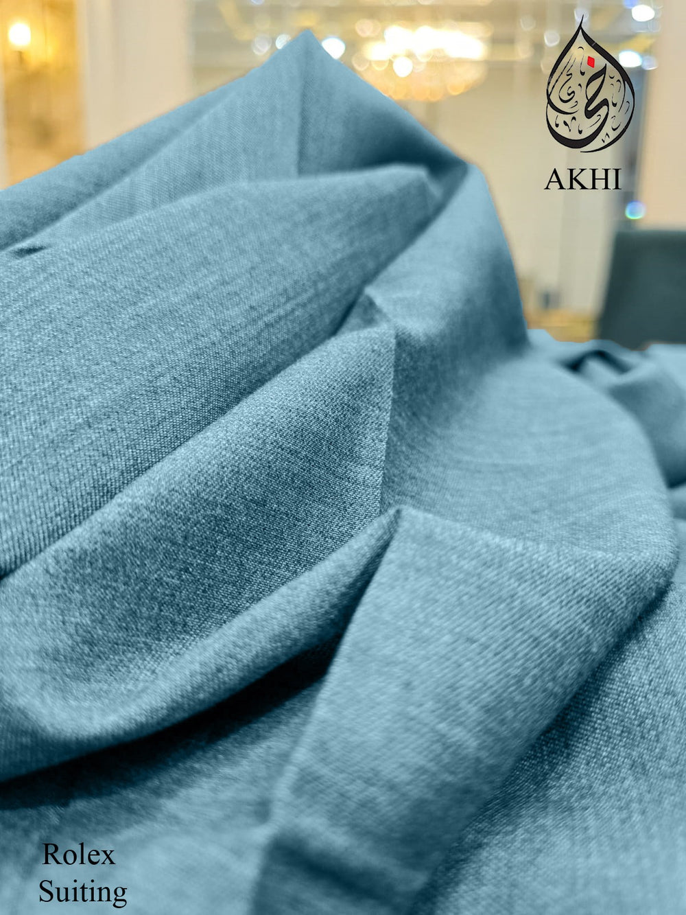 Men’s unstitched suit, Rolex suiting wool, formal wear for men, office wear suit, wedding suit fabric, 4-meter unstitched suit, grayish blue suit, Pakistani men’s formal clothing, luxury men’s suiting, tailored wool suit.